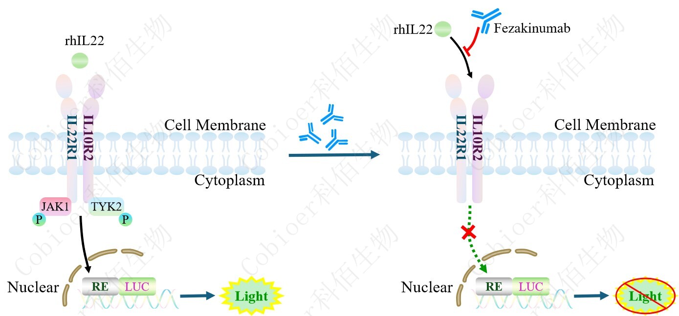 IL22 Effector Reporter Cell 報告基因藥靶模型很好的模擬了體內(nèi) IL22 的信號轉(zhuǎn)導(dǎo)過程, 原理見下圖所示。![]() Figure 1. IL22 Effector Reporter Cell 細胞模型原理圖 |
