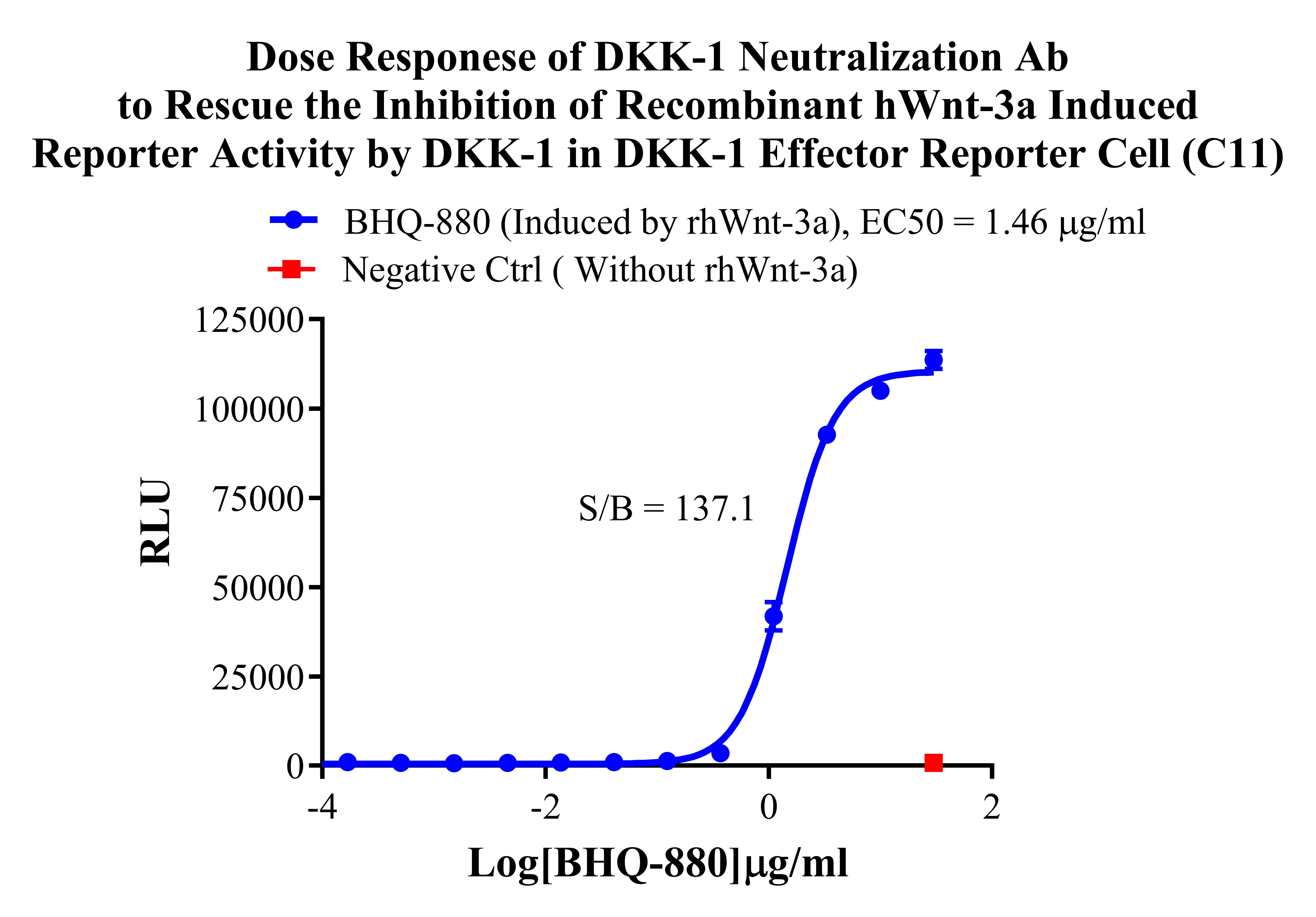 Figure 2.Dose Responese of DKK-1 Neutralization Ab to Rescue the Inhibition of Recombinant hWnt-3a Induced Reporter Activity by DKK-1 in DKK-1 Effector Reporter Cells (C11). |