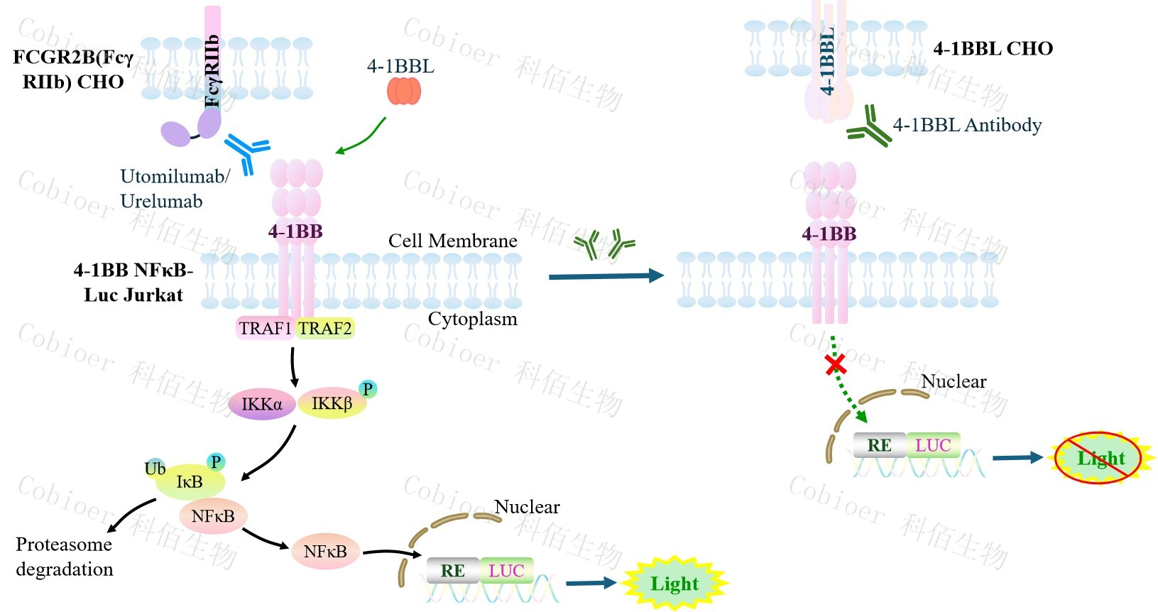 4-1BB NFκB-Luc Jurkat 報(bào)告基因藥靶模型很好的模擬了體內(nèi) 4-1BB 的信號(hào)轉(zhuǎn)導(dǎo)過(guò)程, 原理見(jiàn)下圖所示。