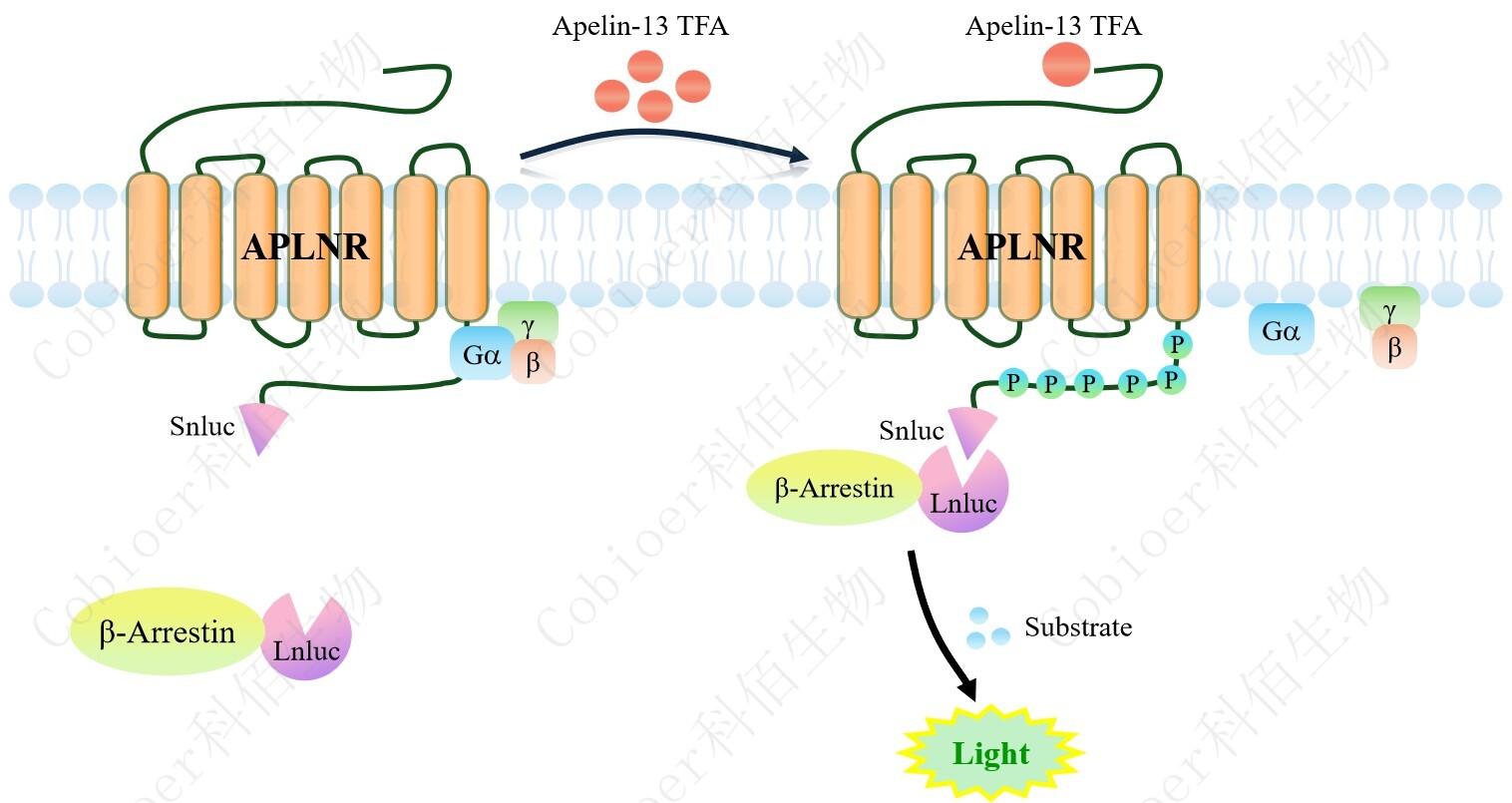 APLNR(APJ) β-Arrestin CHO 報(bào)告基因藥靶模型很好的模擬了體內(nèi) APLNR(APJ) /β-Arrestin 的信號(hào)轉(zhuǎn)導(dǎo)過程,原理見下圖所示。當(dāng)缺乏配體刺激時(shí),β-Arrestin 不與 APLNR (APJ)結(jié)合,融合β-Arrestin 的熒光素酶處于失活構(gòu)象,當(dāng) APLNR(APJ)遭遇配體刺激 時(shí),融合熒光素酶報(bào)告基因的β-Arrestin 被招募,使熒光素酶報(bào)告基因處于激活狀態(tài),加入 其底物后發(fā)光信號(hào)增強(qiáng)。![]() Figure 1. APLNR(APJ) β-Arrestin CHO 細(xì)胞模型原理圖 |
