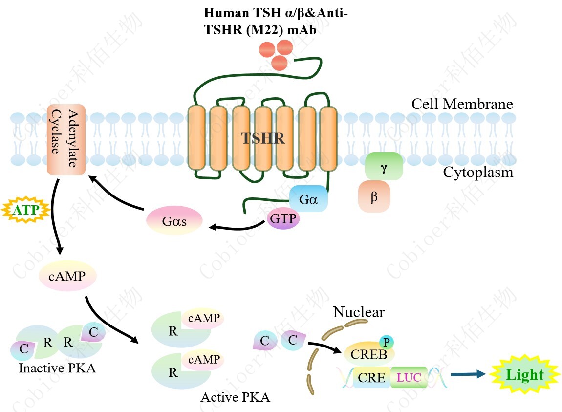 TSHR CRE-Luc HEK293 報(bào)告基因藥靶模型很好的模擬了體內(nèi) TSHR 的信號(hào)轉(zhuǎn)導(dǎo)過(guò)程,原理見(jiàn)下圖所示。