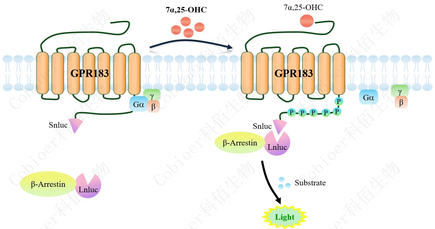 GPR183(EBI2) β-Arrestin CHO 報(bào)告基因藥靶模型很好的模擬了體內(nèi) GPR183(EBI2)/β- Arrestin 的信號(hào)轉(zhuǎn)導(dǎo)過(guò)程,原理見(jiàn)下圖所示。當(dāng)缺乏配體刺激時(shí),β-Arrestin不與 GPR183(EBI2) 結(jié)合,融合β-Arrestin 的熒光素酶處于失活構(gòu)象,當(dāng)GPR183(EBI2)遭遇配體 刺激時(shí),融合熒光素酶報(bào)告基因的β-Arrestin 被招募,使熒光素酶報(bào)告基因處于激活狀態(tài), 加入其底物后發(fā)光信號(hào)增強(qiáng)。
