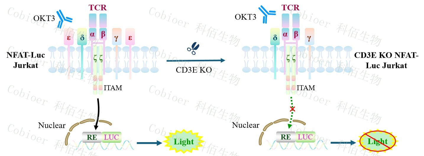 CD3E KO NFAT-Luc Jurkat 報告基因藥靶模型很好的模擬了體內(nèi) TCR 的信號轉(zhuǎn)導(dǎo)過程, 原理見下圖所示。![]() Figure 1. CD3E KO NFAT-Luc Jurkat 細(xì)胞模型原理圖 |