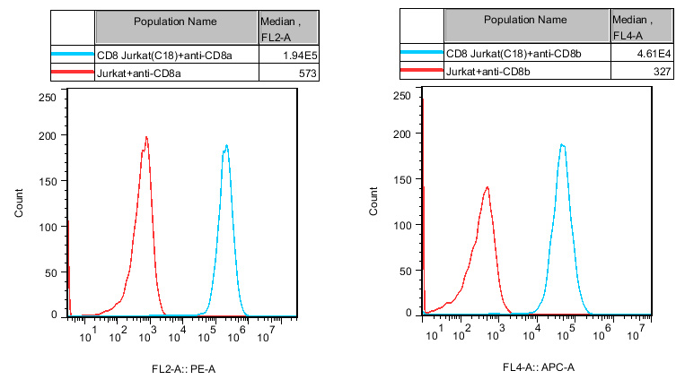 ![]() Figure 1. Recombinant CD8 Jurkat stably expressing CD8a & CD8b.