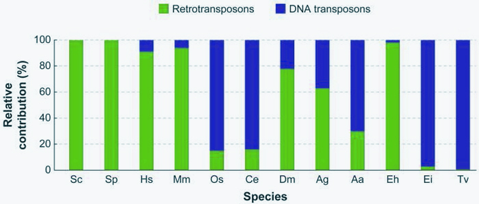 該圖顯示了DNA轉(zhuǎn)座子和逆轉(zhuǎn)錄轉(zhuǎn)座子在各物種中占轉(zhuǎn)座因子總數(shù)的百分比。(Sc:釀酒酵母;Sp:粟酒裂殖酵母;Hs:智人;Mm:小家鼠;Os:水稻;Ce:秀麗隱桿線蟲(chóng);Dm:果蠅;Ag:岡比亞按蚊(瘧蚊);Aa:埃及伊蚊(黃熱病蚊);Eh:溶組織內(nèi)阿米巴;Ei:入侵內(nèi)阿米巴;Tv:陰道毛滴蟲(chóng)。)